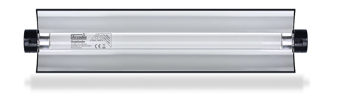 ShadeDweller ProT5 is equipped with a highly functional but removable curved reflector that ensures a UV rich basking area directly beneath the unit. The ShadeDweller ProT5 arrives with the Arcadia Reptile 17% UV-A, 7% UV-B ShadeDweller™ 8 Watt lamp, switch, fittings kit, a single power cable and a free ‘link cable’ to allow you to run up to 10 kits from one power source.